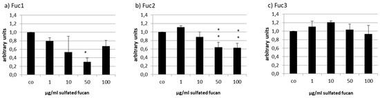 The purified and dried LH sulfated fucans Fuc1, Fuc2, and Fuc3 were dissolved in 5 mg/mL Ampuwa bidest (Fresenius, Schweinfurt, Germany). Before testing, the extracts were filtered with 0.2 µm Sarstedt filters (Nümbrecht, Germany) and further diluted in adequate medium to the concentrations mentioned in 4.6, 4.7, 4.8 and 4.9.