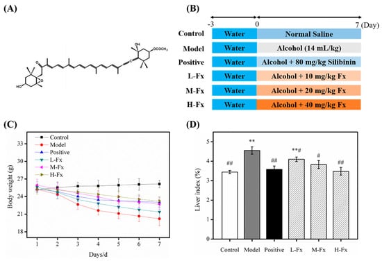 Male ICR mice (6 weeks old) were purchased from the Experiment Animal Center of Zhejiang Province (Hangzhou, China). The protocol was approved by the Experimental Animal Ethics Committee of Zhejiang Ocean University (Zhoushan, China), and our animal certificate was No. SCXK (ZHE 2014-0001). Mice were housed in a constant condition of temperature (22 ± 2 °C) and humidity (55 ± 5%) on a 12-h light/dark cycle. After 7 days of adaptive feeding, 48 mice were stochastically allocated into 6 groups: control group mice were given normal saline (Control), model group mice were given alcohol by gavage (56% w/v, total 10 g/kg b.w.) twice a day, separated by half an hour (Model), positive group mice were given alcohol by gavage 80 mg/kg b.w. Silibinin was used on mice in the positive control group (Positive) [], and for the different Fx groups, mice were given alcohol supplemented with Fx by oral administration of 10 (L-Fx), 20 (M-Fx), and 40 (H-Fx) mg/kg b.w. Positive group and Fx group mice were given alcohol after taking the drug for half an hour. The experimental procedure is shown in Figure 1B and the whole experiment lasted for 7 days. All mice were given controlled food allowances but they could drink water at will. Mouse weights were recorded each day. At day 7, mice were fasted after 12 hours and euthanized by cervical dislocation; serum and tissues were stored at −80 °C.
