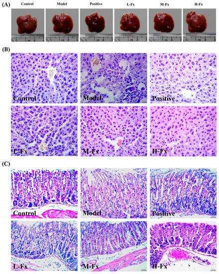 Changes in liver and stomach tissue were evaluated by histopathological observation and hematoxylin and eosin (H&E) staining to assess the protective effects of Fx on these tissues. Each group of liver specimens is shown in Figure 2A. Macro-observation showed that the Model group had an enlarged liver with a rough surface and plaque degeneration. However, administration of Fx and Silibinin modified the degree of swelling and degeneration of liver induced by alcohol.
