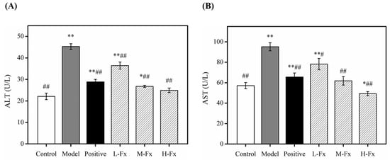 Aspartate transaminase (AST) and alanine transaminase (ALT) are soluble enzymes present in hepatocyte cytoplasm []. After hepatocyte injury, the permeability of the cell membrane increases, causing ALT and AST to enter the bloodstream. Therefore, serum ALT and AST activities can reflect the degree of hepatocyte damage. Serum ALT and AST activities are conventionally used as sensitive markers to evaluate liver damage [,]. The ALT and AST activities recorded from Model group mice were significantly greater than those from Control group mice, indicating that Model group mice were successfully established as an alcoholic liver injury model (Figure 3). ALT and AST activities of Positive group and Fx group mice were significantly less than those of the Model group and gradually tended to Control group (Figure 3). These results indicate that Fx could control ALT and AST activities, thereby reducing alcohol-induced liver injury; this hypothesis is also supported by findings by Han et al. [].