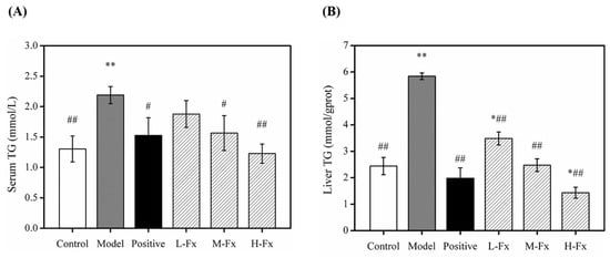 Heavy drinking can lead to accumulation of lipids in the liver. During metabolic processing of alcohol, large amounts of lipase are released, which promotes the synthesis of triglyceride (TG) and causes fat to deposit in liver cells. If a fatty lesion develops in liver tissue, blood lipid levels can rise []. To further illustrate the effect of Fx pretreatment on lipid metabolism in alcohol-induced mice, serum TG levels (A) hepatic TG levels (B) were measured, as shown in Figure 4. TG levels in the serum and liver of Model group mice increased significantly compared to the Control group, indicating that alcohol caused lipid accumulation, resulting in the disorder of lipid metabolism and liver damage. The TG levels in serum and liver were significantly less in Positive and Fx groups than Model group. These results indicate that Fx can effectively alleviate alcohol-induced liver fat deposition.