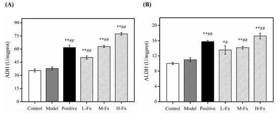 The liver is the main organ used in alcohol metabolism, ADH and ALDH are important enzymes for this process []. When the body ingests a large amount of alcohol, it is dehydrogenated through to form acetaldehyde via ADH, then converted to acetic acid by the action of ALDH; finally, the acetic acid metabolized to water and CO2 via the tricarboxylic acid cycle. ADH and ALDH can metabolize 80% of liver ethanol, which has important anti-alcoholic activity. By detecting the viability of ADH and ALDH, it is possible to reflect the anti-alcoholic capacity of hepatocytes, and further evaluate the protection of Fx on the liver [,]. As shown in Figure 5, after alcohol was administered to mice, hepatic ADH (A) and ALDH (B) activities in the Model group increased slightly, but these activities were not significantly different to those of Control group. However, ADH and ALDH activities of groups that had Fx and Silibinin administered were significantly greater than those of Control group. This indicates that Fx has a certain anti-alcoholic effect, thereby preventing alcohol-induced liver damage.