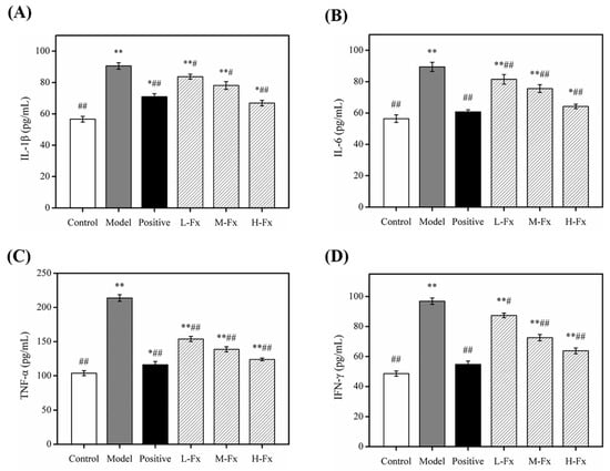 Effects of Fx on the levels of pro-inflammatory cytokines in liver. The release of interleukin-1β (IL-1β) (A), interleukin-6 (IL-6) (B), tumor necrosis factor (TNF-α) (C) and interferon-γ (IFN-γ) (D). Data are given as mean ± SD (n = 8). * p < 0.05, ** p < 0.01 vs. Control group, # p < 0.05, ## p < 0.01 vs. Model group.
