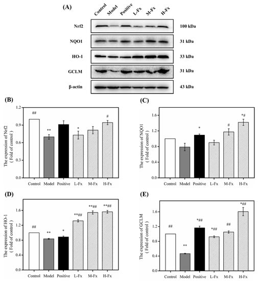 Effect of Fx on the nuclear factor erythrocyte-2-related factor 2 (Nrf2)-mediated antioxidant response. (A) Western blot analysis of Nrf2, NQO1, HO-1 and GCLM in livers; (B) quantitative analysis for Nrf2; (C) Quantitative analysis for NQO1; (D) quantitative analysis for HO-1; (E) quantitative analysis for GCLM. Data are given as mean ± SD (n = 8). * p < 0.05, ** p < 0.01 vs. Control group, ## p < 0.01 vs. Model group.