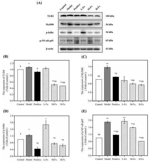 Effect of Fx on toll-like receptor 4 (TLR4)-induced inflammatory response. (A) Western blot analysis of TLR4, myeloid differentiation factor 88 (MyD88), p-IκBα and p-NF-κB p65; (B) the protein levels of TLR4; (C) the protein levels of MyD88; (D) the protein levels of p-IκBα; (E) the protein levels of p-NF-κB p65. Data are given as mean ± SD (n = 8). * p < 0.05, ** p < 0.01 vs. Control group, # p < 0.05, ## p < 0.01 vs. Model group.