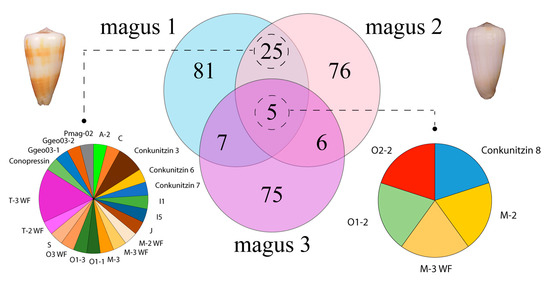 Venn diagram representation of conotoxin precursor and hormone sequences that were shared or unique to the two P. magus individuals from Okinawa (dorsal views shown) and that from the Philippines. For the shared sequences, the proportions of the different conotoxin superfamilies are shown.