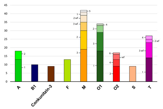 Histogram of the most diverse conotoxin precursor superfamilies found in P. magus. Y axis indicates number of different precursors and color shades indicate proposed paralogs (coded with numbers) within each superfamily.