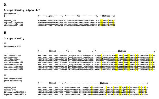 (A) The member of the A superfamily alpha 4/3 in P. magus; (B) two paralogs in the D superfamily. The signal, propeptide, and mature regions (with their cysteine patterns) are shown.