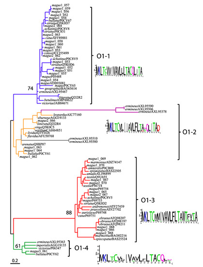 Phylogeny of the O1 superfamily. A maximum likelihood tree using the signal + propeptide regions was reconstructed. Paralog groups are indicated in different colors and the consensus signal sequence for each paralog group is shown. Bootstrap values of main clades are indicated except for O1-2, which was below 50%. Scale bar indicates expected substitutions/site. GenBank accession numbers are indicated after each species except for P. magus.