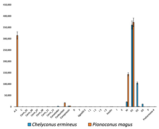 Analyses of the relative abundance of transcripts based on the number of raw reads showed that an O1-3 member (identified as MVIB according to its sequence) dominated in magus1 (48.6% of the total) but had much lower representation in the other individuals (Supplementary Figure S2). This is a δ-conotoxin, which blocks voltage-gated Na+ channels [68] and is a key component of the lightning-strike cabal. The A-2 superfamily conotoxins were the most abundant in magus2 (53.3%; Supplementary Figure S2). These conotoxins show the IV cysteine framework and were found to be K+ channel blockers in the closely related Pionoconus striatus [69]. Finally, the most abundant conotoxin in magus3 was an A superfamily alpha 3/5 (15.6%), although members of the M and O1 superfamilies were also abundant (Supplementary Figure S2). The alpha 3/5 inhibits muscle nAChRs and has been shown to be key in fish hunting in piscivorous Indo-Pacific cones [70,71]. With regards to the differential expression analyses between the piscivorous Indo-Pacific P. magus and the Atlantic C. ermineus, the M and A-2 superfamilies appeared to be more expressed in the former whereas the O2 and O3 superfamilies were more expressed in the latter. Both species showed high levels of expression of the O1 superfamily (Figure 5).