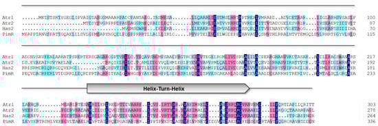 Secondary metabolite production is one of the basic processes in Streptomyces and is carefully controlled by subtle and precise regulatory systems []. Regulatory and transporter proteins are integral to controlling the biosynthesis of antibiotics. Two LuxR family regulators (Atr1 and Atr2), two ABC transporters (Atr29 and Atr30) and one SARP regulator (Atr32) were found to reside in both upstream and downstream regions of the atr gene cluster. To characterize the function of the LuxR family regulators in production, a widely used in silico analysis was performed. LuxR family transcriptional regulators are key players in important physiological functions and are widely involved in biological processes such as quorum sensing and modulating secondary metabolism []. There are two typical functional domains in LuxR family regulators, a signal-binding domain in the N-terminal and a DNA-binding domain with a classical Helix-Turn-Helix (HTH) domain in the C-terminal region []. In general, LuxR family proteins bind to DNA in a dimeric form and specifically recognize hallmark sequences of given target gene’s regulatory region []. By aligning the amino acid sequences of Atr1 and Atr2 with the LuxR family, including Has2 (ALF39547.1, Streptomyces sp. LZ35) and PimR (CAE51066.1, Streptomyces natalensis), the results revealed that the HTH motifs of the LuxR family were highly conserved (Figure 1), which is mainly responsible for the protein multi-polarization and activation with gene promoters [,]. Even though the primary structure of LuxR was quite different, the advanced structure of LuxR was roughly the same enough to perform its positive regulation [].