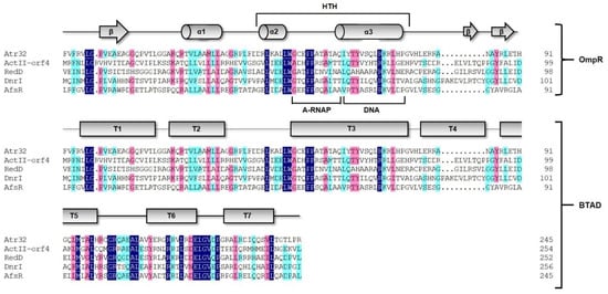 To compare the amino acid sequence characteristics, other SARP regulators such as ActII-ORF4 (AAK32147.1, Streptomyces coelicolor A3(2)), a regulator of actinic purine production, DnrI (AAA26736.1, Streptomyces peucetius), a regulator of daunorubicin biosynthesis, RedD (AAA88556.1, Streptomyces coelicolor A3(2)), a regulator of undecyl erythromycin assembly, and the multi-effect regulatory factor AfsR (BAA14186.1, Streptomyces coelicolor A3(2)) were aligned and putative active motifs of the proteins were predicted by analysis of the conserved domains (Figure 2). These analyses revealed that the OmpR-like domain likely contains three alpha helices (α1, α2 and α3) whereas the α2, α3 and 10 residue loops form an HTH domain and the W1 and W2 flanks are composed of β-sheets at both ends [,]. The α2 helix acts as a scaffold and the α3 helix may be responsible for recognizing the major groove of DNA []. The amino acids between the α2 and α3 helices may interact with the alpha subunit of RNA polymerase (RNAP). In addition to other homologous proteins, the BTAD of Atr32 is also composed of seven tetratrico peptide repeats containing intact conserved cores (T1–T7), this architecture is required for functional SARP family proteins [].