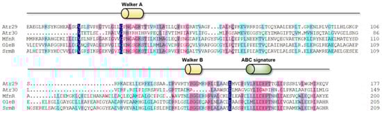 The essential synthetic and regulatory genes of most Streptomyces BGCs contain transporter genes belonging to the ATP-binding cassette transporter family [,]. Currently, the known ABC transporters are classified into three categories according to their different structural features; these categories are Type I, Type II and Type III []. Although research on the ABC transporters within BGCs has been limited to date, it is generally believed that these proteins are involved in both intracellular and extracellular transport of antibiotics and production of their precursors []. According to Blastp and multiple sequences alignment, Atr29 contains the conserved Walker A, B motif and ABC signature motif, indicating that it belongs to the Type I sub-family of ABC transporters and might be associated with atratumycin efflux (Figure 3). Unlike the Type I ABC transporter Atr29, Atr30 belongs to the Type II sub-family of ABC transporters. Atr30 appears to be a hydrophilic protein containing nucleotide-binding domains without any hydrophobic transmembrane region and likely functions as a dimeric structure.