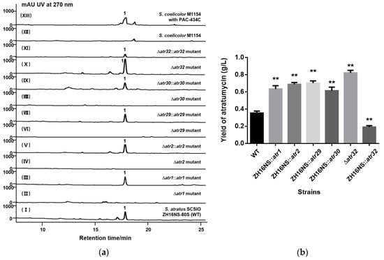 HPLC analyses of secondary metabolites. (a) Comparative HPLC analysis of the secondary metabolites of the wild type S. atratus SCSIO ZH16NS-80S (WT) with regulatory and transporter gene-complementation strains. (I) the wild type S. atratus SCSIO ZH16NS-80S; (II) Δatr1 mutant strain; (III) Δatr1::atr1, atr1-complementation mutant strain; (IV) Δatr2 mutant strain; (V) Δatr2::atr2, atr2-complementation mutant strain; (VI) Δatr29 mutant strain; (VII) Δatr29::atr29, atr29-complementation mutant strain; (VIII) Δatr30 mutant strain; (IX) Δatr30::atr30, atr30-complementation mutant strain; (X) Δatr32 mutant strain; (XI) Δatr32::atr32, atr32-complementation mutant strain; (XII) the wild type S. coelicolor M1154 strain and (XIII) mutant strain S. coelicolor M1154 with PAC-434C. (b) Comparative analysis of atratumycin yield between over-expression mutants and the wild type strain (** p < 0.01). The values are mean ± SD from three different experiments.