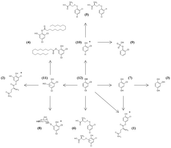 Proposed metabolic pathway for the detoxification of 2,4-DCP by the isolated mesophotic fungi. The isomers were suggested according to MS2 data and literature. For metabolites where there is no information about the most probable isomer, an asterisk has been added next to the molecule. The number next to each compound is the one corresponding to Table 2.