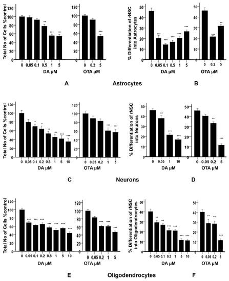 2.5. Effects of DA and OTA on Cytotoxicity and on the Differentiation of rNSC Directed into Neurons
