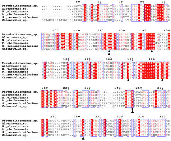 Amino acid sequence alignment of ALT3695 with ulvan lyases from Pseudoalteromonas sp. PLSV (PLSV_3936, GenBank accession no. WP_033186995.1), Alteromonas sp. A321 (ALT3695, GenBank accession no. MN347032), Nonlabens ulvanivorans PLR (NLR_492, GenBank accession no. WP_036580476.1), Paraglaciecola chathamensis S18K6 (GCHA_4617, GenBank accession no. GAC12534.1), Siansivirga zeaxanthinifaciens CC-SAMT-1 (AW14_13480, GenBank accession no. AJR04515.1), and Catenovulum sp. CCB-QB4 (C2869_03520, GenBank accession no. AWB65560.1). Active site residues are marked with filled circles (●). Highly conserved residues are marked with filled triangles (▲).