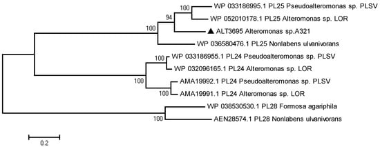 Phylogenetic tree of ALT3695 (filled triangle) and other ulvan lyases generated using the neighbor-joining method. Numbers along the branch nodes represent bootstrap percentages based on 1000 resamplings. The scale bar indicates the average number (0.2) of amino acid substitutions per site. Pseudoalteromonas sp. PLSV (PLSV_3936, GenBank accession no. WP_033186995.1), Alteromonas sp. LOR (LOR_29, GenBank accession no. WP_052010178.1), Nonlabens ulvanivorans (NLR_492, GenBank accession no. WP_036580476.1), Pseudoalteromonas sp. PLSV (PLSV_3925, GenBank accession no. WP_033186955.1), Alteromonas sp. LOR (LOR_107, GenBank accession no. AMA19991.1), Pseudoalteromonas sp. PLSV (PLSV_3875, GenBank accession no. AMA19992.1), Alteromonas sp. LOR (LOR_61, GenBank accession no. WP_032096165.1), Formosa agariphila KMM 3901 (BN863_22190, GenBank accession no. WP_038530530.1), and Nonlabens ulvanivorans PLR (IL45_01510, GenBank accession no. AEN28574.1).