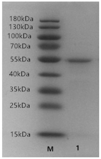 Soluble expression of His-tagged ALT3695 ulvan lyase was achieved in E. coli BL21 (DE3) by adding 1 mM isopropyl-β-d-thiogalactopyranoside (IPTG). The recombinant ALT3695 was purified, and SDS-PAGE showed only a single protein band. The purified ALT3695 showed a specific activity of 1.88 U/mg protein, with 52% recovery (Table 1). As expected, the apparent molecular weight was 53 kDa (Figure 3), which is similar to that previously reported for PL25 family ulvan lyases, such as LOR_29 (52 kDa) [16] and NLR_492 (55 kDa) [16]. The molecular weight of ulvan lyases from other families, such as IL45_01510 (GenBank accession no. AEN28574.1, PL28) [14] and PsPL (GenBank accession no. AMA19992.1, PL24) [22], were about 46 kDa and 59 kDa, respectively.