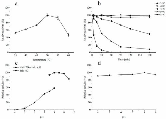 Biochemical characterization of ALT3695. (a) Activity of ALT3695 over a range of temperatures (35–60 °C) to determine the optimal temperature. (b) Thermal stability of ALT3695. (c) Activity of ALT3695 over a range of pH values to determine the optimal pH. (d) The pH stability of ALT3695.