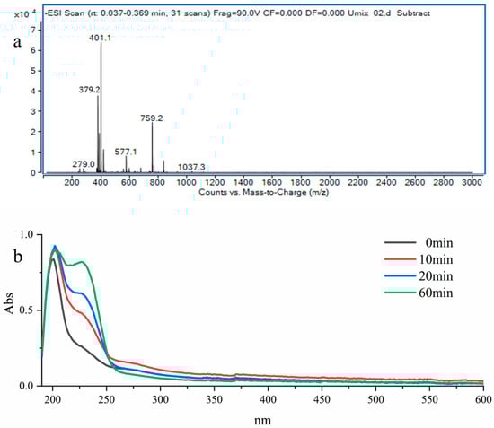 To obtain enzymatic products for analysis, purified ALT3695 was incubated with ulvan (5 mg·mL−1) for 3 h at 35 °C. Then, product samples were collected, and the product molecular weights were measured by negative-ion ESI-MS (Agilent 1290 Infinity II-6460, Agilent Corp., Wilmington, DE, USA; Frag = 90.0 V, m/z 100–3000 amu). Full wavelength scans (190–600 nm) were obtained during enzymatic degradation.