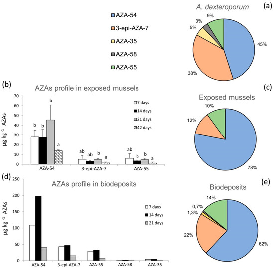 AZAs toxin profile: (a) relative abundance of AZAs in Azadinium dexteroporum Mediterranean strain; (b) AZAs bioaccumulation in whole tissue of mussels fed on A. dexteroporum after 7, 14, 21 days of exposure and after 21 days of recovery (42 days) (mean ± standard deviation of three experimental replicates); (c) AZAs toxin profile in mussel whole tissue during the 21 days of exposure (mean of the whole period); (d) AZAs toxin profile in biodeposits produced by mussels fed on A. dexteroporum during the exposure (7, 14, 21 days); (e) AZAs toxin profile in biodeposits during the 21 days of exposure (mean of the whole period). Different letters on top of the histogram bars indicate significant differences between means, within the same AZA analogue.