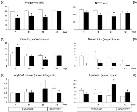 Immunological responses in haemocytes of exposed mussels revealed a significant inhibition of phagocytosis capacity (Figure 3a). The lysosome membrane stability, as neutral red retention time (NRRT), showed a decreasing trend with statistically significant differences after 14 and 21 exposure days (Figure 3b). The proportion of haemocytic subpopulation, granulocyte/hyalinocyte ratio, displayed a biphasic time-dependent modulation in exposed mussels, with a statistically significant increase after seven days followed by a strong decrease after 21 days (Figure 3c). After 21 days of recovery, exposed and control organisms showed comparable levels of immunological parameters (Figure 3a–c).