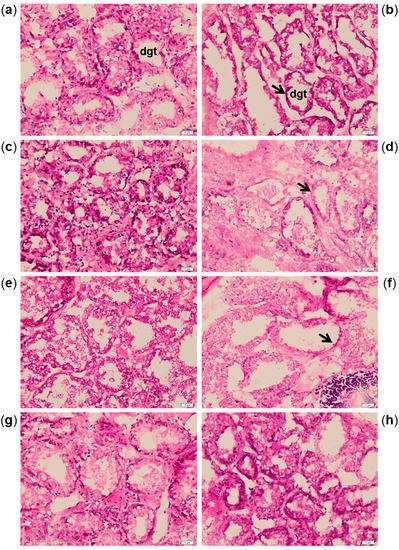 Haematoxylin–eosin staining on digestive gland tubules (dgt) of control mussels (a,c,e,g) and mussels exposed to Azadinium dexteroporum (b,d,f,h). The pictures are representative of samples from 7 (a,b), 14 (c,d) and 21 (e,f) days of exposure and 21 days of recovery (g,h). The black arrows indicate the thinned digestive tubules in exposed mussels. Magnification: 200×.