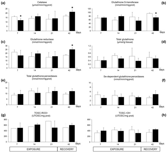 Antioxidant parameters analysed in Mytilus galloprovincialis exposed to Azadinium dexteroporum (black bars) and control mussels (white bars). (a) Catalase activity; (b) glutathione S-transferases activity; (c) glutathione reductase activity; (d) total glutathione level; (e) activity of total glutathione peroxidases; (f) activity of Se-dependent glutathione peroxidases; (g) total oxyradical scavenging capacity against peroxyl radicals (TOSC-ROO●); (h) total oxyradical scavenging capacity against hydroxyl radicals (TOSC-●OH). Values are expressed as mean ± st. dev. (n = 5). Asterisks represent statistically significant differences between exposed and control groups (p < 0.05).