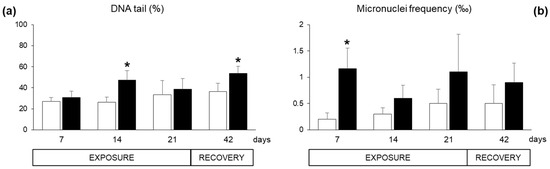Specific responses of neurotoxicity, measured as acetylcholinesterase (AChE) activity in the haemocytes, were not altered during the exposure period (data not shown). Concerning genotoxic damage, the Comet assay revealed DNA fragmentation in haemocytes of exposed organisms after 14 days and at the end of the recovery, while the results were not statistically different at day 7 and 21 (Figure 6a). The micronuclei frequency was enhanced both during the exposure period and after the recovery, with statistically significant difference only at day seven (Figure 6b).