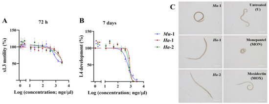 Each of these three extracts (i.e., Mu-1, Ha-1 and Ha-2) exhibited a dose-dependent inhibition of xL3 motility (half-maximum inhibitory concentration (IC50) values ranging from 0.7 ± 0.01 µge/µL to ~ 3.0 µge/µL; see Section 3.1 for an explanation of “µge/µL”) and of fourth-stage larvae (L4) development (IC50 values of ~ 0.6 µge/µL for each extract) of H. contortus (Figure 1 and Table 1). The Mu-1-treated xL3s exhibited a ‘circular’ phenotype, whereas xL3s treated separately with extracts Ha-1 and Ha-2 showed a ‘straight’ phenotype (Figure 1).