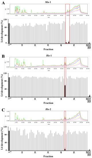 The chromatographic fractions (n = 60) from each active lead-like enhanced (LLE) extract (i.e., Mu-1, Ha-1 and Ha-2) were tested for inhibitory effects on xL3 motility and L4 development. None of the fractions (from any LLE extract) inhibited xL3 motility by ≥ 70%. These observed differences in xL3 motility inhibition between extracts and their respective fractions might be due to the relatively high concentrations of active compounds present in the extracts and/or the synergistic effects of the compounds. However, for Mu-1, three consecutive fractions (44–46), which corresponded to a singular ultraviolet (UV)-absorbance peak in the HPLC chromatogram, elicited a pronounced inhibition of L4 development (Figure 2). In addition, fraction-43 elicited the most significant (P < 0.0001) reduction in L4 development of both extracts Ha-1 and Ha-2 (Figure 2). The observed differences in the degree of reduction of L4 development by the active fractions of these two extracts (see Figure 2) might be associated with differences in the mixture of active compound present (see Section 2.5), resulting from the variations in location or time of collection and/or genetic variability of the sponge and/or its associated micro-organisms.