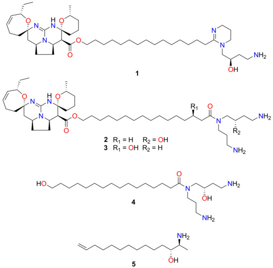 Fromiamycalin belongs to a unique family of complex pentacyclic guanidine alkaloids (PGAs) [38]. The hydrochloride salt of fromiamycalin (1), the compound purified in this study, was originally isolated from an acetone extract from the New Caledonian starfish, Fromia monilis, along with the related pentacyclic guanidine derivatives, crambescidin 800 (2), celeromycalin (3) and a hydroxyspermidine-hydroxyacid derivative (4) [38] (Figure 3); subsequently, 1 was also purified from Monanchora arbuscula [39]. Apart from fromiamycalin, several other PGAs, including ptilomycalins [40,41], monanchocidins [42,43], monanchomycalins [44,45], crambescidins 826, 359 and 431 [28,46] as well as normonanchocidins [47], have been purified from members of the genus Monanchora.