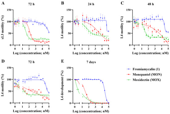 In vitro activity of fromiamycalin (1) on larval stages of Haemonchus contortus. Dose-response curves for fromiamycalin (1) on xL3 motility (panel A), L4 motility (panels B–D) and L4 development (panel E).
