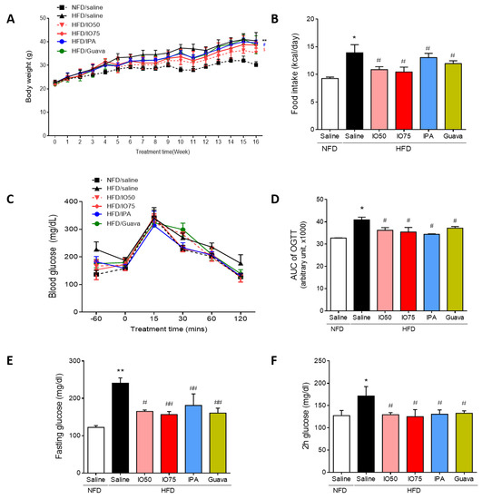 Six-week-old C57BL/6N male mice were used in this research. Animals were acclimated for 1 week. After acclimation, the mice were fed a 45% high-fat diet (HFD; Research Diets, Inc., New Brunswick, NJ, USA) for 8 weeks, except for the control group. After 4 weeks, the mice were allocated into six treatment groups: NFD/Saline, HFD/Saline, HFD/IO50, HFD/IO75, HFD/IPA, HFD/Guava. Each group was orally administrated saline and IO50 (50 mg/kg/day), IO75 (75 mg/kg/day), IPA (1.35 mg/kg/day) for 4 weeks after the separation. During the 8 weeks, the body weight, fasting glucose test, and feeding glucose test was measured once every week. An oral glucose tolerance test (OGTT) was performed once before the animals were sacrificed and the data were analyzed through the calculation of the area under curve (AUC). The animal protocol for the experiments was approved by the Animal Center of Lee Gil Ya Cancer and the Diabetes Institute of Gachon University. All experiments conformed to the AAALAC international guidelines and veterinary advice. The number of this study is LCDI-2018-0112.