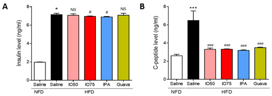 Next, we assessed whether the activation of the insulin and C-peptide level in the blood of HFD mice was regulated by HFD/IPA to control glucose metabolism. As shown in Figure 2A, the insulin level was significantly higher in HFD mice than in NFD mice, indicating that insulin resistance was induced in HFD mice. However, the insulin level was significantly lower in the HFD/IO (75 mg/kg) and HFD/IPA (1.35 mg/kg) groups than in HFD mice. As shown in Figure 2B, the C-peptide level was significantly higher in HFD mice than in NFD mice, indicating that the pancreas produced insulin to regulate glucose homeostasis. In contrast, the increase in C-peptide level was markedly decreased by HFD/IO (50 and 75 mg/kg), HFD/IPA (1.35 mg/kg), and HFD/Guava (75 mg/kg) treatment. These results showed that the decrease in insulin and C-peptide levels by IPA and IO containing IPA could regulate glucose homeostasis in HFD-induced insulin resistance.