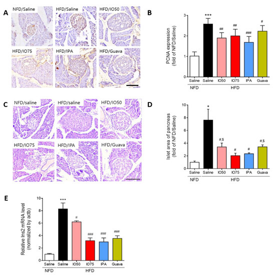 To examine whether the increased number of pancreatic islet cells in HFD mice was reduced by IPA and IO for the protection of β-cell function, we investigated the effect of IPA on the change in morphology and the area of pancreatic islets in HFD mice by using immunohistochemistry and hematoxylin and eosin (H & E) staining. The proliferating cell nuclear antigen (PCNA), a proliferative cell marker, was detected to examine the proliferation of pancreatic islet cells [24]. As shown in Figure 3A,B, we measured the intensity of PCNA staining in representative images to quantify the effect of IPA and IO on the proliferation of β-cells in the pancreatic islets. The PCNA intensity in pancreatic islet cells in HFD mice was significantly higher than in NFD mice. However, the increased PCNA intensity was significantly decreased in the HFD/IO, HFD/IPA, and HFD/Guava groups. As shown in Figure 3C,D, the size of pancreatic islets from the histological changes in HFD mice was markedly elevated compared with that in NFD mice, whereas the size of pancreatic islets was significantly reduced in the HFD/IO, HFD/IPA, and HFD/Guava groups. These data suggested that IPA and IO containing IPA could protect against pancreatic dysfunction that occurs in HFD-induced diabetes.