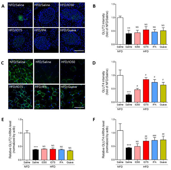 Interestingly, the transcription of GLUT2 and GLUT4 is known to regulate glucose sensing and glucose transporters [27]. We measured the mRNA expression of GLUT2 and GLUT4 in the pancreas and skeletal muscle of HFD mice by qRT-PCR to evaluate glucose metabolism by IPA. As shown in Figure 4E,F, the mRNA expression of GLUT2 and GLUT4 was significantly decreased in HFD mice compared with that in NFD mice. The decrease in mRNA expression of GLUT2 was not significantly different in the IO (25 and 75 mg/kg), IPA (1.35 mg/kg), and Guava (75 mg/kg) treatment groups. However, the decrease in the mRNA expression of GLUT4 was significantly increased by the IO (25 and 75 mg/kg), IPA (1.35 mg/kg), and Guava (75 mg/kg) treatments. These results indicated that the increase in GLUT4 expression by IPA can improve glucose transport, thereby controlling glucose homeostasis, in HFD mice.