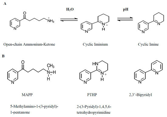 - Zoltewicz, J.A.; Bloom, L.B.; Kem, W.R. Quantitative determination of the ring-chain hydrolysis equilibrium constant for anabaseine and related tobacco alkaloids. J. Org. Chem. 1989, 54, 4462–4468. [Google Scholar] [CrossRef]