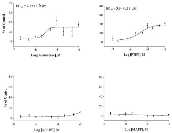 PTHP was the only anabaseine analog that approached anabaseine in potency and binding affinity. Its potency and affinity for both the frog and human neuromuscular receptors was slightly inferior to that of anabaseine, but its agonist activity on vertebrate nAChRs had not been reported (Please see Figure 3 and Figure 4). The other analogs displayed less than 1% of anabaseine’s potency and binding affinity. The small potency of 2,3′-bipyridyl can be interpreted as being entirely due to its monocationic form, since the pKa of the most basic nitrogen on the 2′pyridyl ring is 4.4 [34].