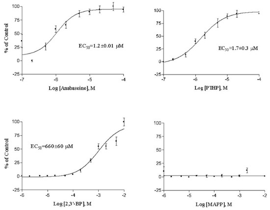 [3H]-carbamylcholine ([3H]-MCC) binding assays with rat brain membranes were carried out as previously reported with a final concentration of 0.5 nM [3H]-MCC [8,54]; 2.8 µM atropine sulfate (Sigma-Aldrich) was added to inhibit binding to muscarinic receptors. [3H]-Cytisine and [125I]-α-bungarotoxin ([125I]-α-BTX) were used in binding experiments with whole rat brain and TE671 cell membranes, respectively, according to Kem et al. [41]. Rat brain membranes (200 μg of protein) on TsA201 cell membranes (100 μg protein) expressing human α4β2 nAChRs were incubated with 0.5 nM [3H]-cytisine in a final volume of 500 µL of binding saline for 4 h at 5 °C. The experiments on α7 nAChRs rat brain membranes involved incubation with 0.5 nM [125I]-α-Btx for 3 h at 37 °C to assure that equilibrium was reached. Eight different concentrations of the experimental compound were usually tested in triplicate. Nonspecific binding was measured in the presence of 1 mM (S)-nicotine hydrogen tartrate (Sigma-Aldrich). Data were fitted using GraphPad Prism software (Version 4 GraphPad Software, San Diego, CA, USA) by nonlinear regression analyses to a sigmoidal one-site model with variable slope. Compound affinity for Torpedo electric organ membrane nAChRs was assessed by inhibition of 0.5 nM [125I]-α-BTX binding over a 30 min incubation period at 5 °C, since α-Btx binds irreversibly to skeletal muscle nAChRs. The IC50 was also estimated by the same Prism software.