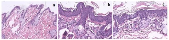 Skin histology samples of female FVB/n mice, magnification 200×, hematoxylin and eosin (H&E) staining: (a) Normal skin histology in wild-type groups (I and III); (b) Epidermal hyperplasia in K14human papillomavirus(HPV)16 transgenic mice; (c) Epidermal dysplasia in K14HPV16 transgenic mice.