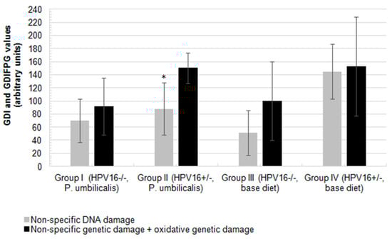 Mean values of non-specific genetic damage index (GDI, grey) and oxidative genetic damage index resulted from the assay with an extra step of digestion with formamidopyrimidine DNA glycosilase (FPG, GDIFPG, black), measured in peripheral blood cells of female FVB/n mice (n = 11 for each group). Asterisk (‘*’) represents statistically significant differences (p = 0.006) relative to non-specific DNA damage (grey) in group II, in comparison to the control group IV (grey). Bars represent the standard deviation.