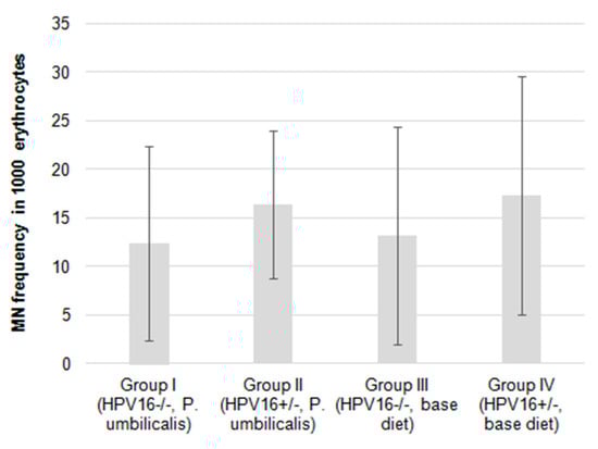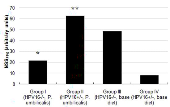 Relative organ weights were calculated as the ratio of the organ weight to the animal’s bodyweight. The data were analyzed using IBM SPSS software, version 25. The statistical approach used analysis of variance (ANOVA), followed a Bonferroni test. A Chi-squared test was performed for the histological lesions. Student’s t tests were performed for the comet and micronucleus assays. In all tests, we compared the HPV−/− and the HPV+/− groups fed with different diets (P. umbilicalis-supplemented animals and base diet-fed animals). So, group I compared to group III and group II to group IV. Differences were considered statistically significant in all the analyses when p < 0.05.