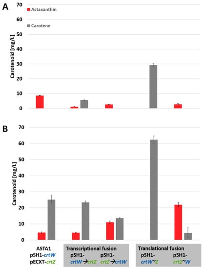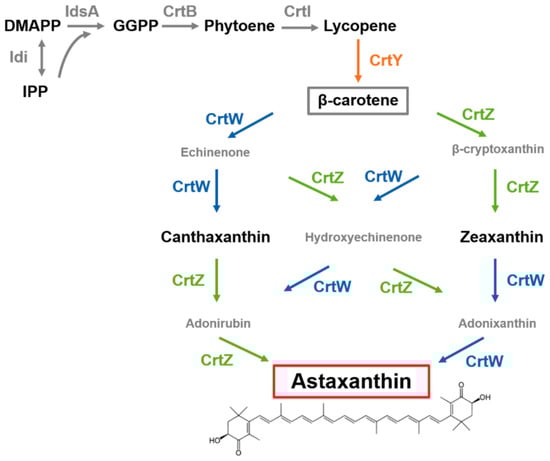 - Wu, Y.; Yan, P.; Liu, X.; Wang, Z.; Tang, Y.J.; Chen, T.; Zhao, X. Combinatorial expression of different beta-carotene hydroxylases and ketolases in Escherichia coli for increased astaxanthin production. J. Ind. Microbiol. Biotechnol. 2019. [Google Scholar] [CrossRef] [PubMed]