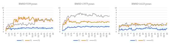 All of the generated binding poses were manually inspected in order to ensure correct positioning within the binding pocket with respect to the interactions of ligand moieties with the amino acid residues relevant for the catalytic activity. The residues Phe19, Met20, Ala33, Pro38, Lys58, Phe57, Ala75, Glu72, Arg106, and Arg126 play an important role in the interactions of FABP4 with inhibitors [37,38]. Initially, these residues were used as a filter to discard the incorrect poses derived from the docking. In addition, molecular dynamics (MD) simulation studies of three of the most promising compounds (Table 1, 5339, 14123, and 13575) were conducted to verify the effectiveness of the poses selected. In particular, for each selected ligand, we performed three 20 ns MD simulations using three different poses, named P1–P3, where the P1 ones are those that visually satisfy the aforementioned reported key interactions, whereas the others two (P2 and P3) lack some of them. The results reported in Figure 3 as root-mean-square deviation (RMSD) fluctuations of the ligand coordinates clearly highlight the two unfavorable poses, i.e., those with higher RMSD fluctuations [39]. These present even less persistence of the hydrogen bond interactions with the key residues. On the contrary, the best poses (P1) show very low RMSD fluctuation.