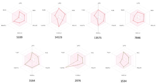 Radar plots of the six drug-likeness parameters used to predict the oral bioavailability of the seven investigated compounds. The colored zone is a suitable physicochemical space for oral bioavailability. LIPO (Lipophility): −0.7 < XLOGP3 < 5.0; SIZE: 150 g/mol < MW < 500 g/mol; POLAR (Polarity): 20 Å2 < TPSA < 130 Å2; INSOLU (Insolubility): 0 < Log S (ESOL) < 6; INSATU (Insaturation): 0.25 < Fraction Csp3 < 1; FLEX (Flexibility): 0 < Num. rotatable bonds < 9. All results have been obtained from the SwissADMET web server [50].