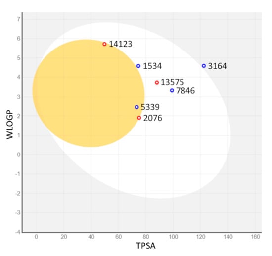 Human gastrointestinal absorption (HIA) and blood–brain barrier penetration (BBB), relative to the absorption and distribution parameters, respectively, have been graphically represented by the extended and renewed version of the Edan–Egg model, named the Brain or IntestinaL EstimateD (BOILED) permeation predictive model (BOILED-Egg). The visual analysis of Figure 6 highlights that all investigated molecules, with the exception of 3164, were predicted to be passively absorbed by the gastrointestinal tract, and three of them, 5339, 14123, and 2076, passively permeate through the BBB, the first with the aid of the P-glycoprotein and the other two without it. These data are reflected in the values shown in Table 3.