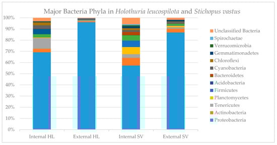 Graph shows the relative abundance of OTU on a Phylum level (HL = Holothuria leucospilota, SV = Stichopus vastus).