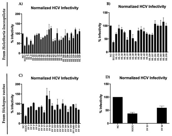 (A) and (C) Inhibition of HCV infectivity of extracts derived from bacterial isolates of the external sea cucumber parts; (B) and (D) Inhibition of HCV infectivity of extracts derived from bacterial isolates of the internal sea cucumber parts. NC-negative control, epigallocatechin gallate (EGCG)-positive control. Viability assay results are given in the supplementary section (Figure S4).